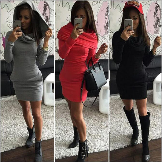 Who said you can't be hot on a winter dress? Features a full frontal neck and body covering with additional hood for a warm effect, above the knee length to showcase your favorite boots, knit type fabric to match the winter season, and body hugging shape for that irresistible hot chic in the middle of winter touch!